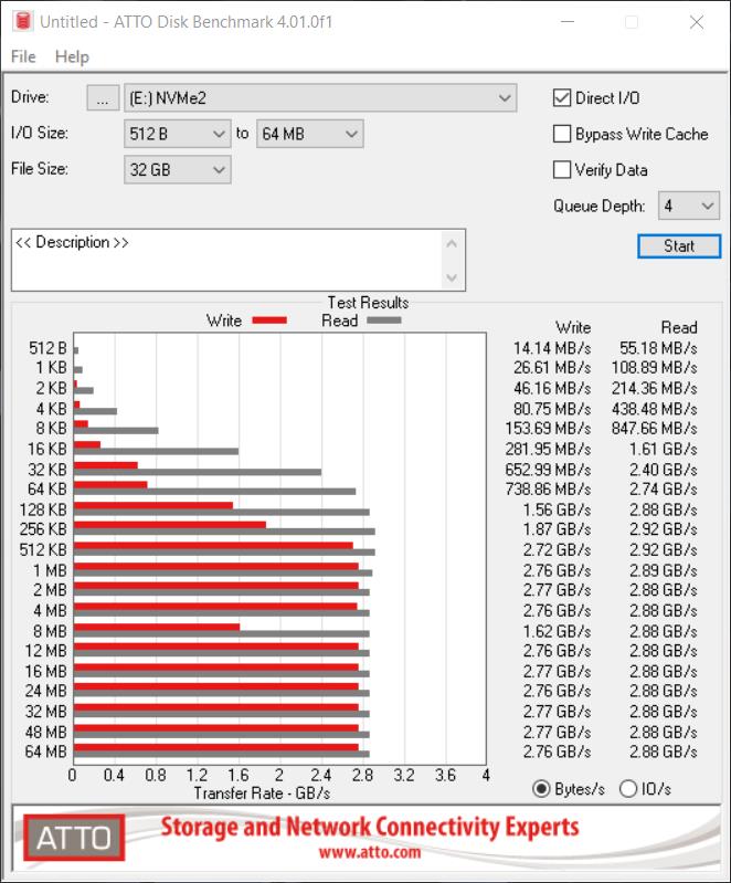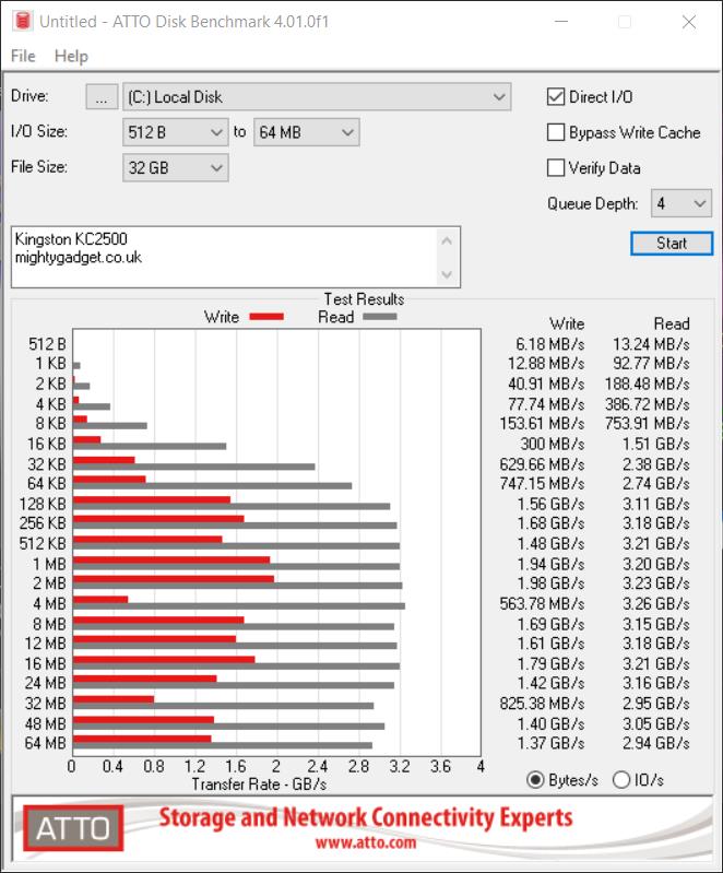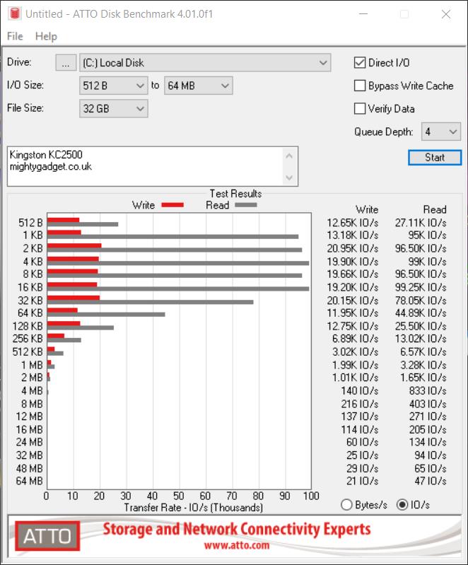 With ATTO Disk benchmark the IRDM offered some significant advantages over the KC2500 in some tests. In particular, the IOPs was far greater than the Kingston, as were the write speeds for most of the test. However, the read speeds capped out a 2.88GB/s while the Kingston went up to 3.26GB.s
