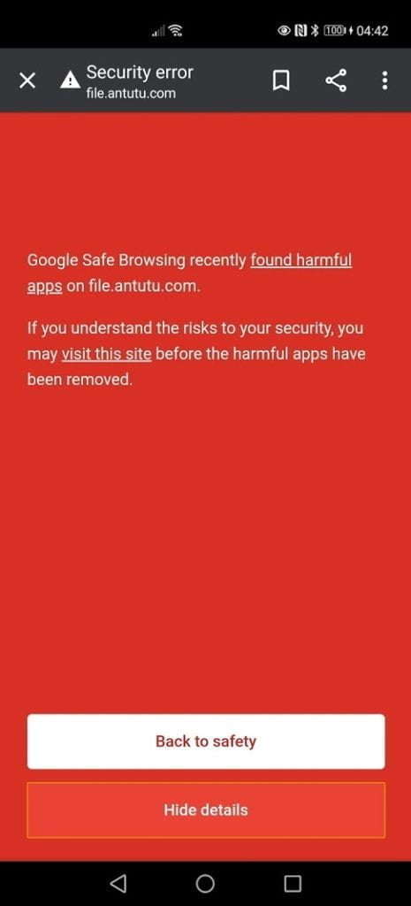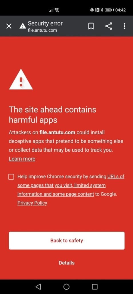 Now, when you go to Antutu and try to download the APK with Chrome, you get a warning that the site ahead contains harmful apps.