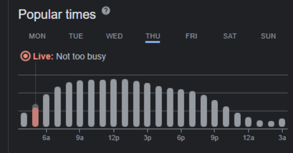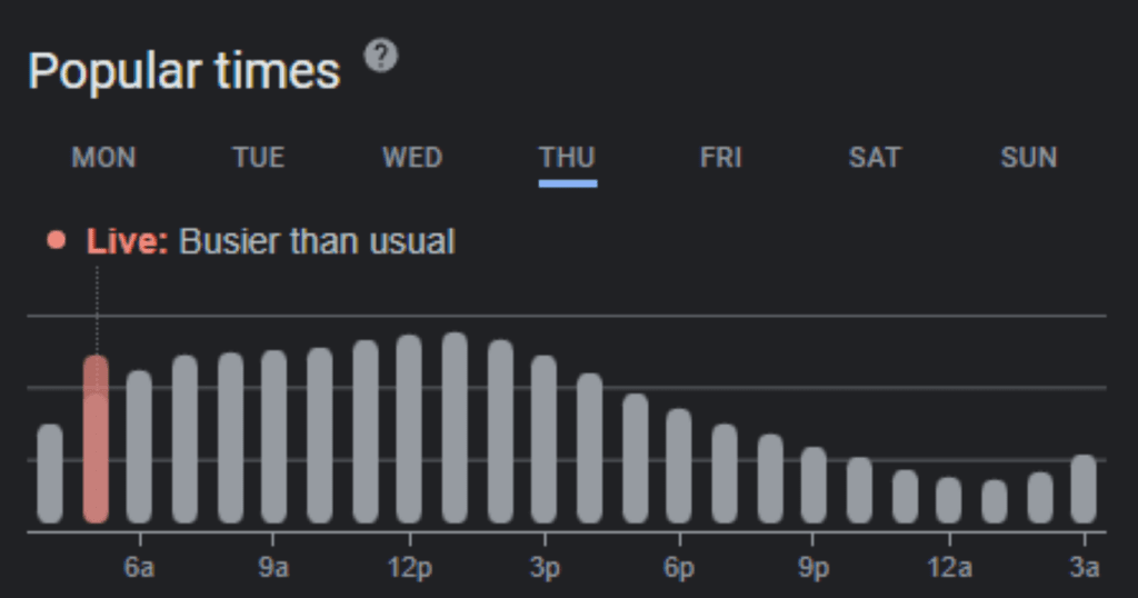 However, in the case of Heathrow Airport, as I write this, the live data appears to indicate it is not too busy. Though the historical trend indicates, it is not until 7am that it reaches peak businesses.