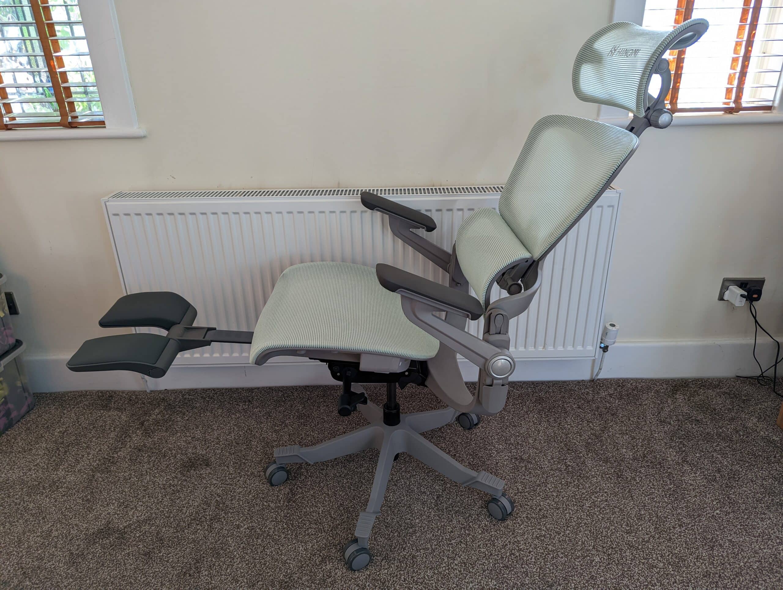 The leg rest is a big plus for me. I find that sitting in a normal position all day long can give me restless legs, and I like to be able to stretch them out. If you don’t want to use it, you can flip the padded rest back over on itself and then retract everything back under the chair.
