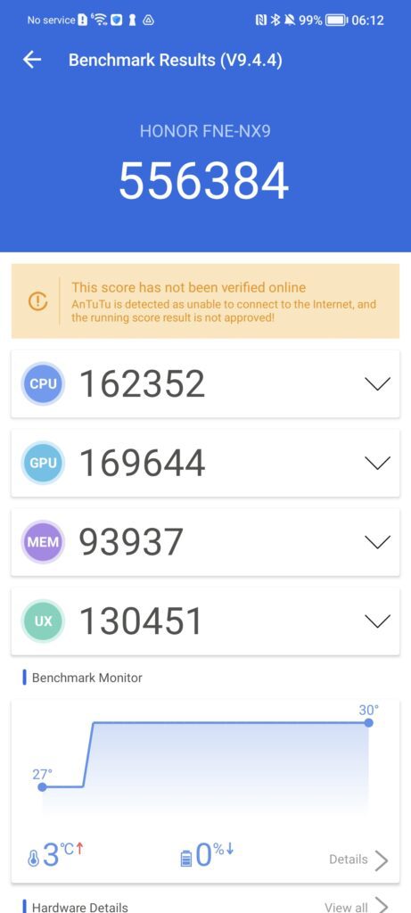 Battery drops just 2% during the test, and the temperature increases 13°C. In comparison, the Honor 50 with the SD778 had an 11°C rise in temperature and a drop in battery from 93% to 86%.