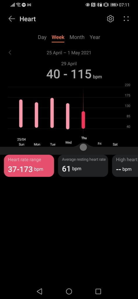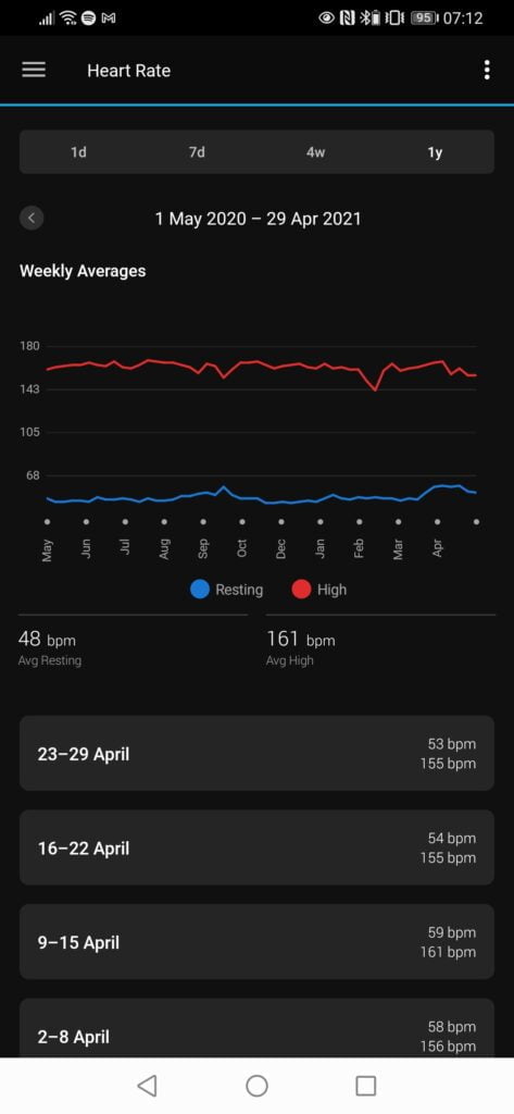 Garmin is equally confusing; I have often looked at the current HR on my watch, and it is lower than what is being reported as my RHR. Garmin does generally report lower readings than Huawei Health, which for me is 48bpm vs 57bpm.