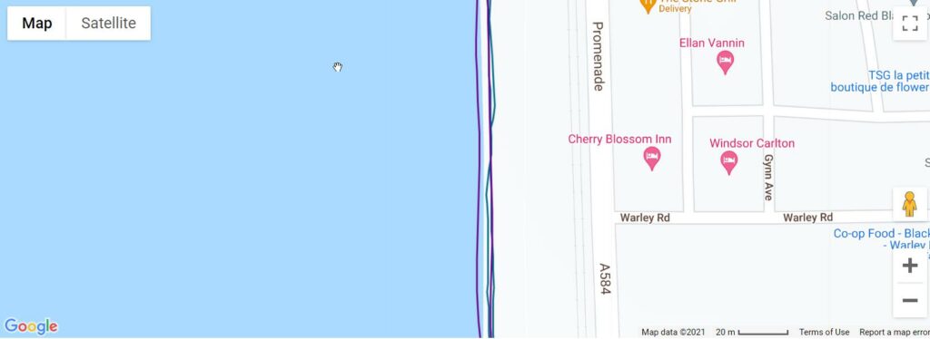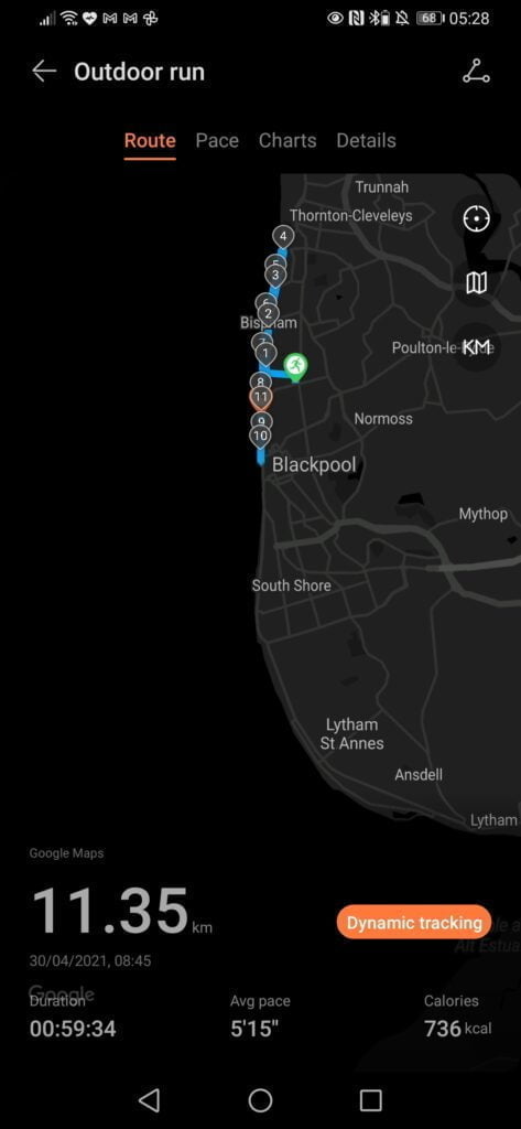 The band connects to the phone GPS quite fast, and I haven’t noticed any significant dropouts. GPS accuracy seems to be close to my Garmin. Looking at the plotted map from the exported files shows the Honor tracking my running in the sea rather than the promenade more than Garmin but the overall distance is almost identical.