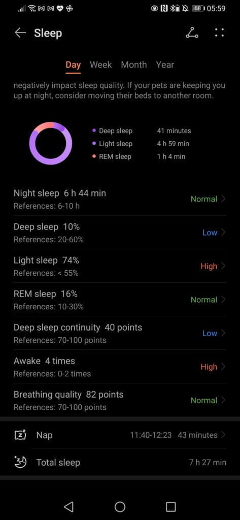 The analysis of my sleep seems to be more accurate than Garmin (which costs over 10x more in the case of the Fenix 6 Pro). It informs me that my light sleep is too much, my deep sleep continuity is poor, and I wake up too much. That is about the most accurate description of my sleep throughout my life you can get.