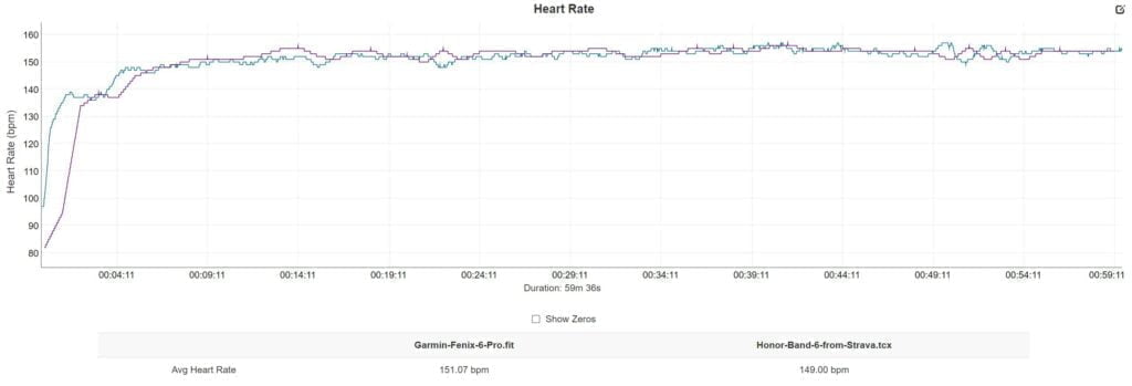 Even indoor cycling did OK. In a recent Zwift group ride, the Honor was 4bpm off, which looks to be caused by one big spike which went up to 173bpm vs 154bpm average and 164bpm max on my Garmin.