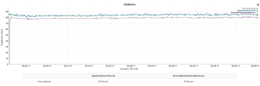 Heart rate accuracy is OK, better than some wrist-based heart rate solutions. There are no massive spikes or dips, so better than some solutions. Average HR seems to be around 2bpm off my Garmin chest strap, but the max HR is 5bpm off. Pretty good for a device this cheap. Similar to cadence, it looks like the sampling rate is much lower.