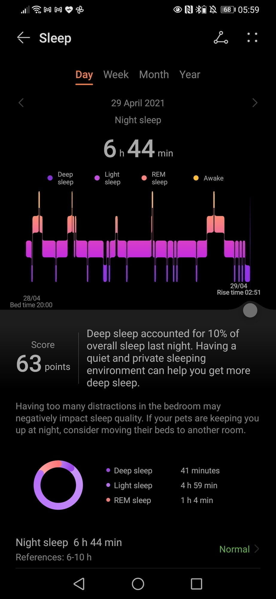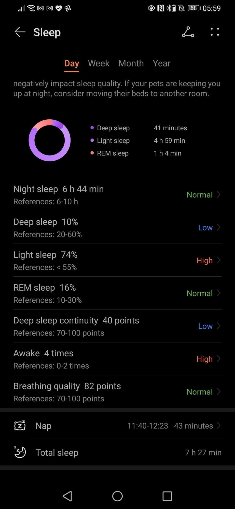 The analysis of my sleep seems to be more accurate than Garmin (which costs over 10x more in the case of the Fenix 6 Pro). It informs me that my light sleep is too much, my deep sleep continuity is poor, and I wake up too much. That is about the most accurate description of my sleep throughout my life you can get.