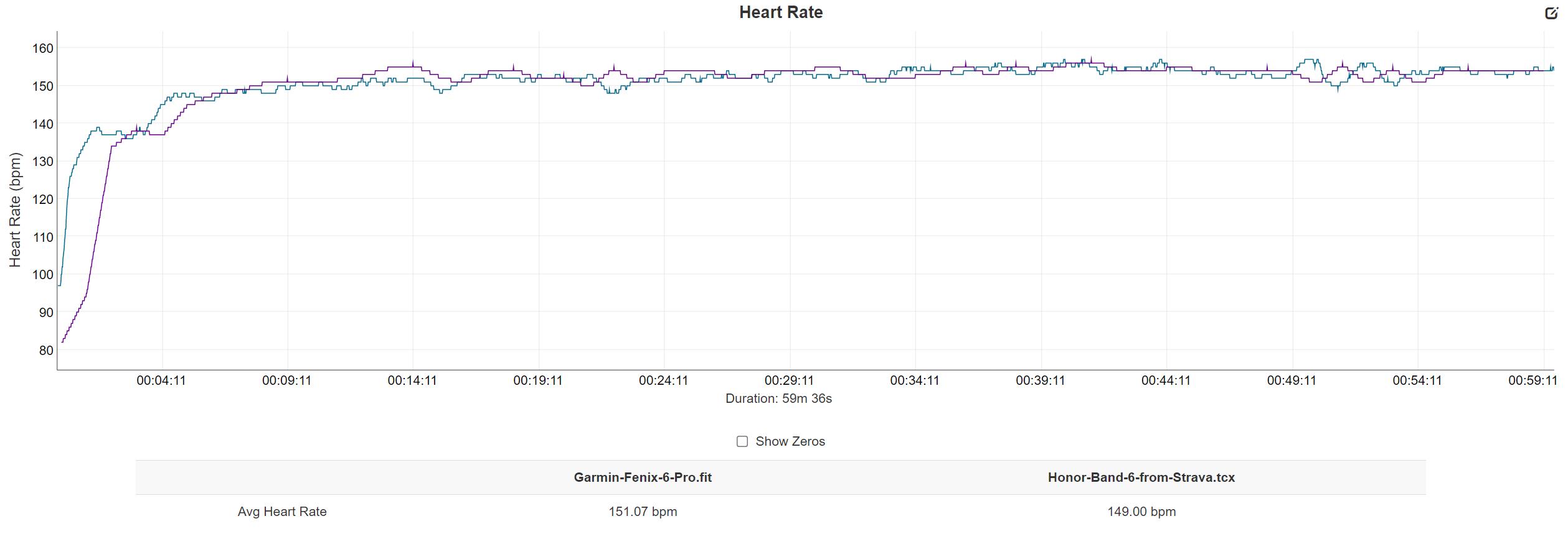 Even indoor cycling did OK. In a recent Zwift group ride, the Honor was 4bpm off, which looks to be caused by one big spike which went up to 173bpm vs 154bpm average and 164bpm max on my Garmin.