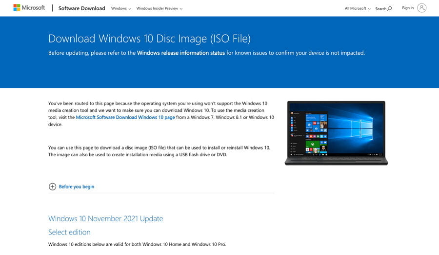 1. Go to the official Microsoft Windows 10 download page