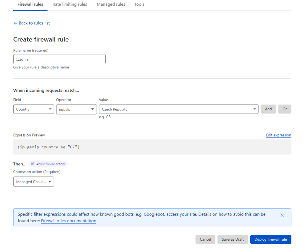 Blocking traffic from Czechia and Seychelles using Cloudflare