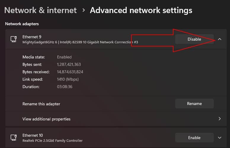3. Choose the Connection: Choose the network adaptor settings you want to change and click the little sideways arrow to expand, then select additional properties