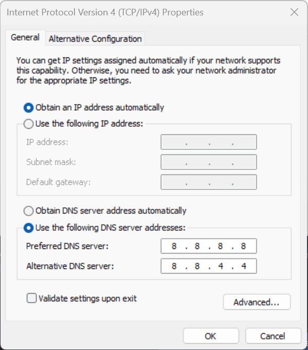 • Enter the desired DNS addresses in the “Preferred DNS server” and “Alternate DNS server” fields (e.g., Google’s DNS: 8.8.8.8 and 8.8.4.4).
