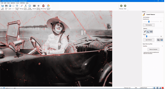 The SoftOrbits Photo Retoucher has an automatic tool for detecting scratches, making it easier to see scratches. With the scratches button, identify marks or areas that you want to be removed and remove them using the remover tool. Zoom the picture close to locate any detailed defects that might be hard to notice by naked eyes when the image is far.
