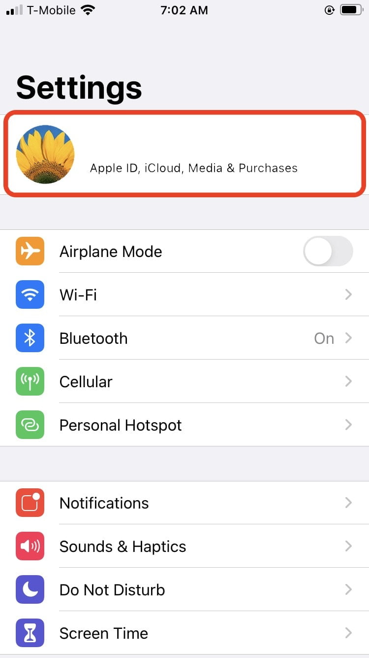 - In the “Settings” app, tap on your Apple ID at the top.