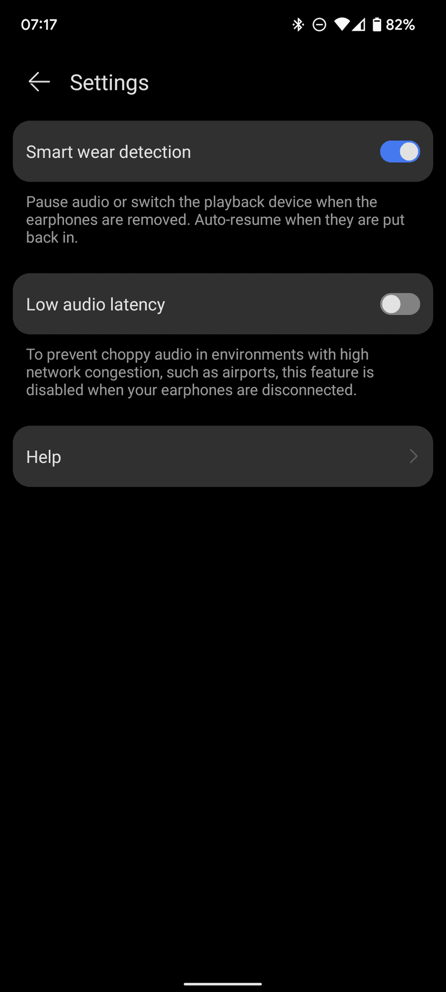 Apart from the EQ and LDAC control, you also have the ANC control, battery information, find my earbuds and the ability to program the gesture control. Within the settings, you can enable low audio latency, and you can disable smart wear detection.