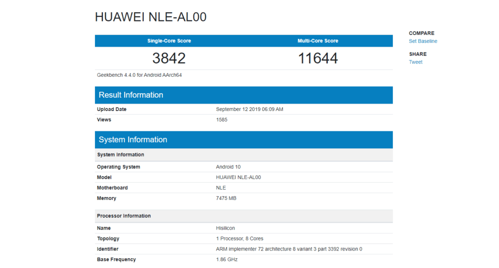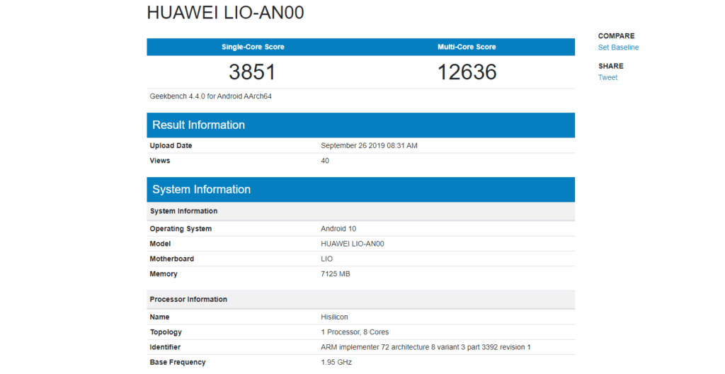 A device with a name HUAWEI LIO-AN00 has popped up on Geekbench which was carried on on the 26th of September. The device scored 3,851 points in single-core and 12,636 points in multi-core results.