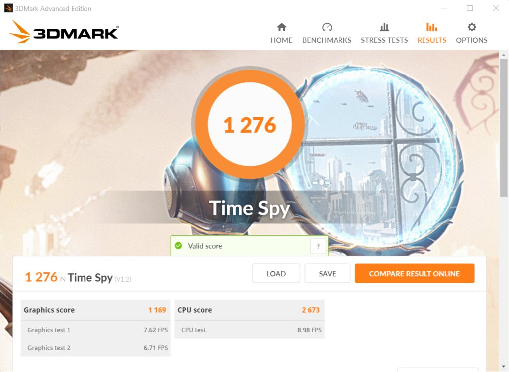 • 3DMark Time Spy: 1276 (CPU: 2673 GPU: 1169)