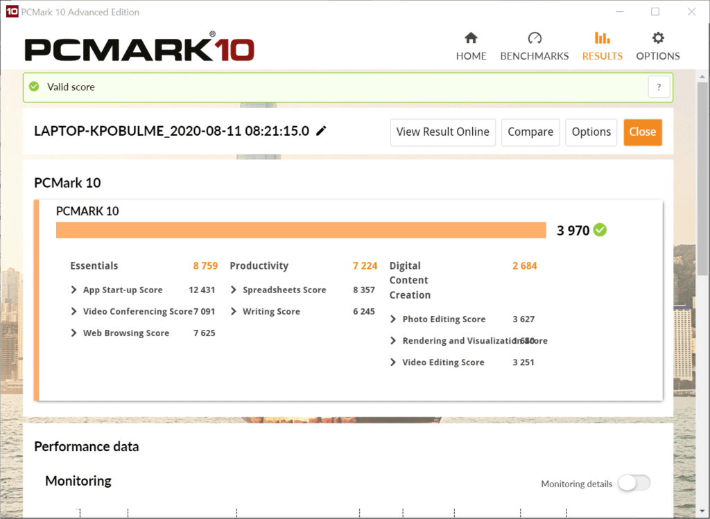 • PCMark: 3970 (Essentials: 8759 Productivity: 7224 Digitial: 2684)