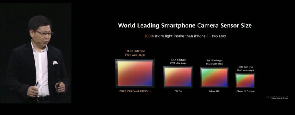 On top of those big number specs, the sensor size itself has been massively increased the main RYYB lens on each phone is a 1/1.28 sensor size up from 1/1.17 on the P30 Pro, and significantly larger than the Galaxy S20+ and iPhone 11 Pro Max.