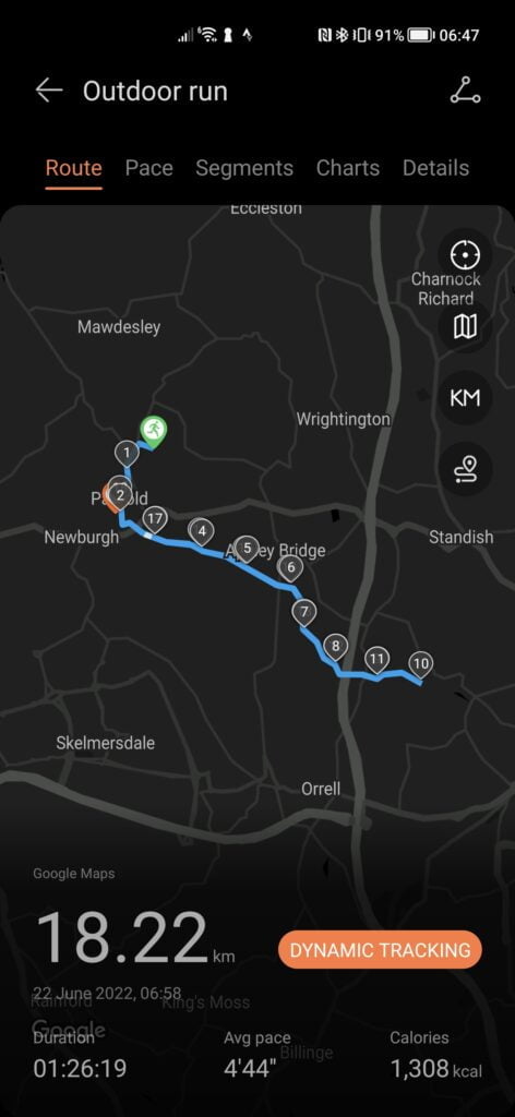 Looking at my run down a canal, I wouldn’t say either my Garmin or the Huawei were as accurate as I’d like. Both plotted routes veered off into the middle of the canal for quite a lot of the run. For this run, I’d probably say the Huawei was a little more accurate.