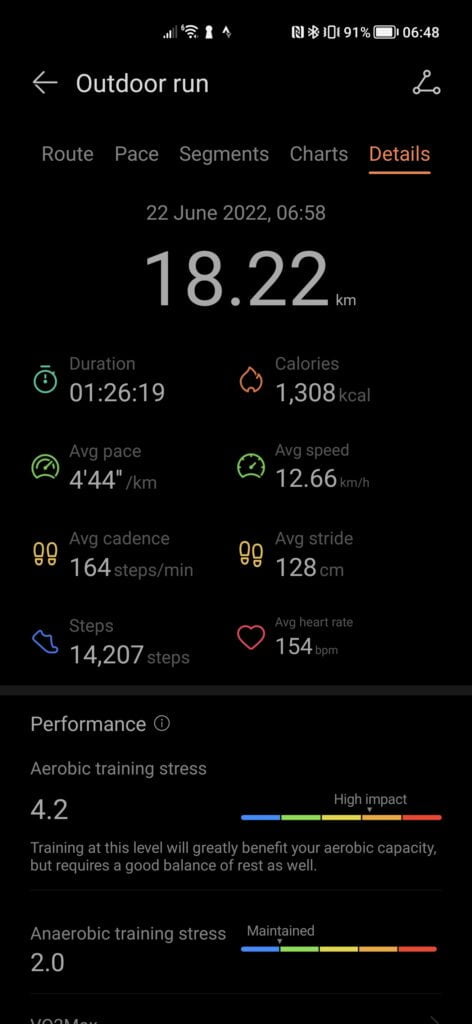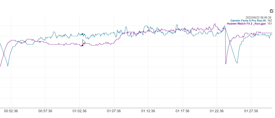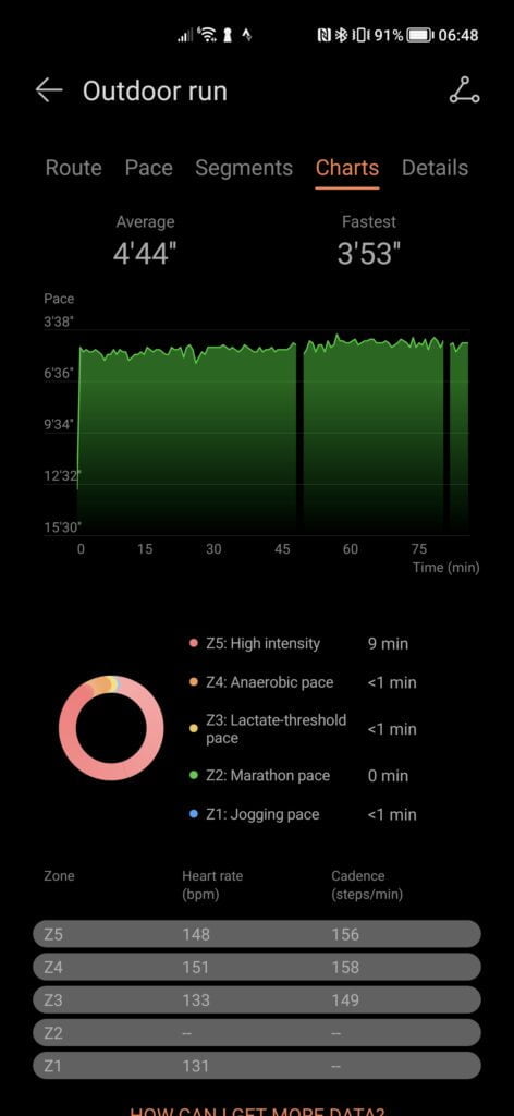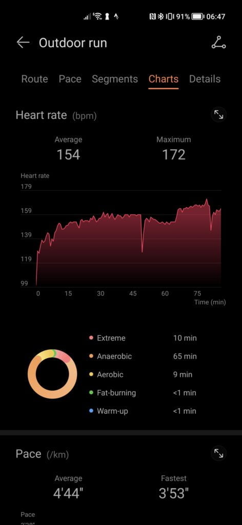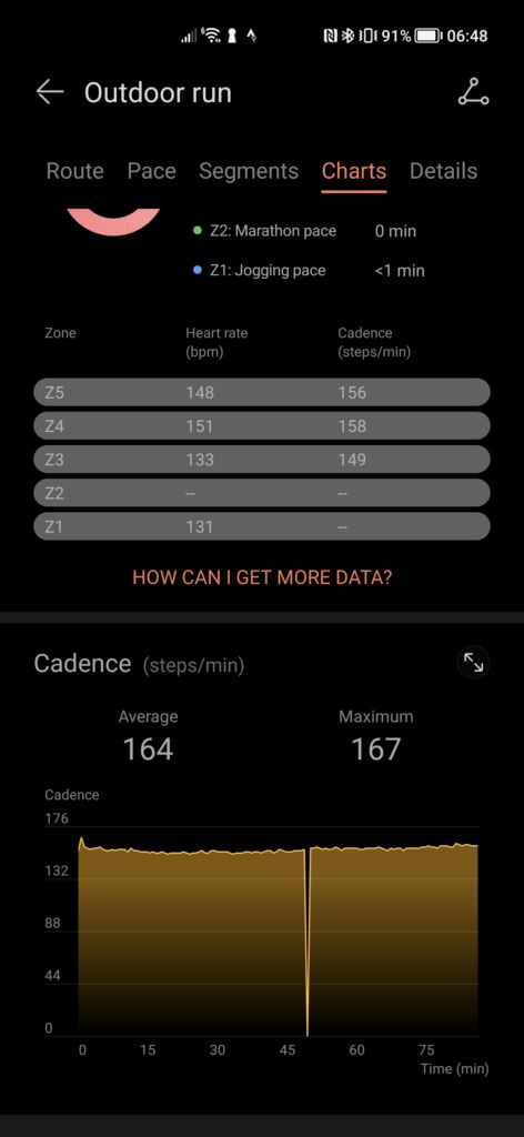 Both the heart rate and distance averaged out at almost the same, which is what is most important for me at the end of the day. However, Huawei underreports cadence by almost ten steps per minute compared to the Garmin, which was also paired with a Stryd running power meter.