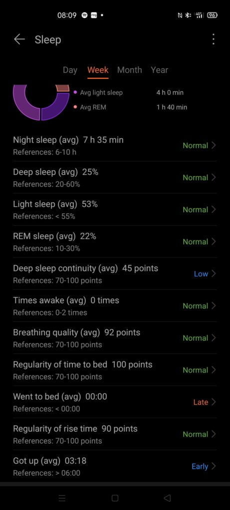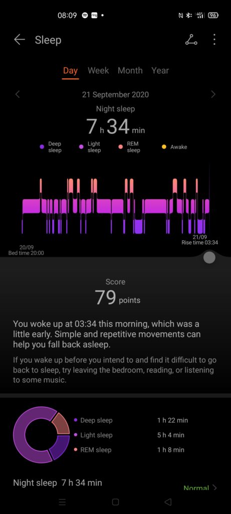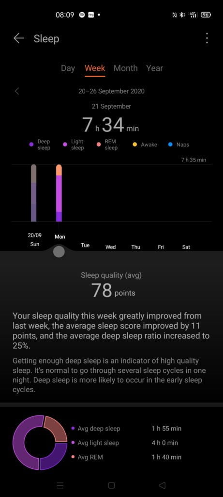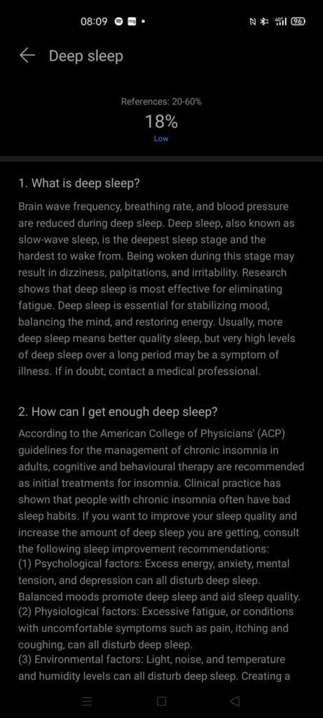 Even though the accuracy of Garmin has improved, the overall feedback from Huawei continues to be superior. It shows an extensive breakdown of each phase and its duration as well as options to click on each item for a detailed description of its importance.