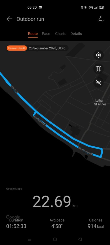 There are minor discrepancies in distances, but as I don’t regularly use three devices at once, it is hard to tell which is more accurate. On my run, the Garmin tracking 22.56km while the Huawei tracked 22.69km. So 130m difference which represents 0.57%.
