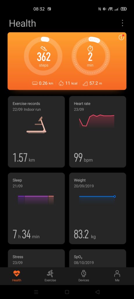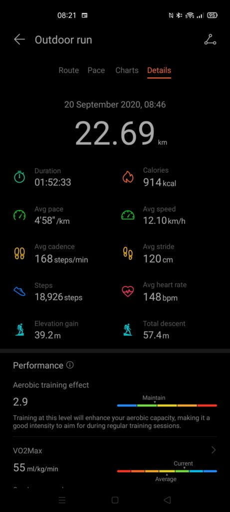 I have not done a lot of runs, but it says my VO2Max is 55 which is the same as the Garmin Fenix 6 Pro. So either Huawei is doing a good job at calculating the VO2Max with their own algorithms, or they are still using First Beat.
