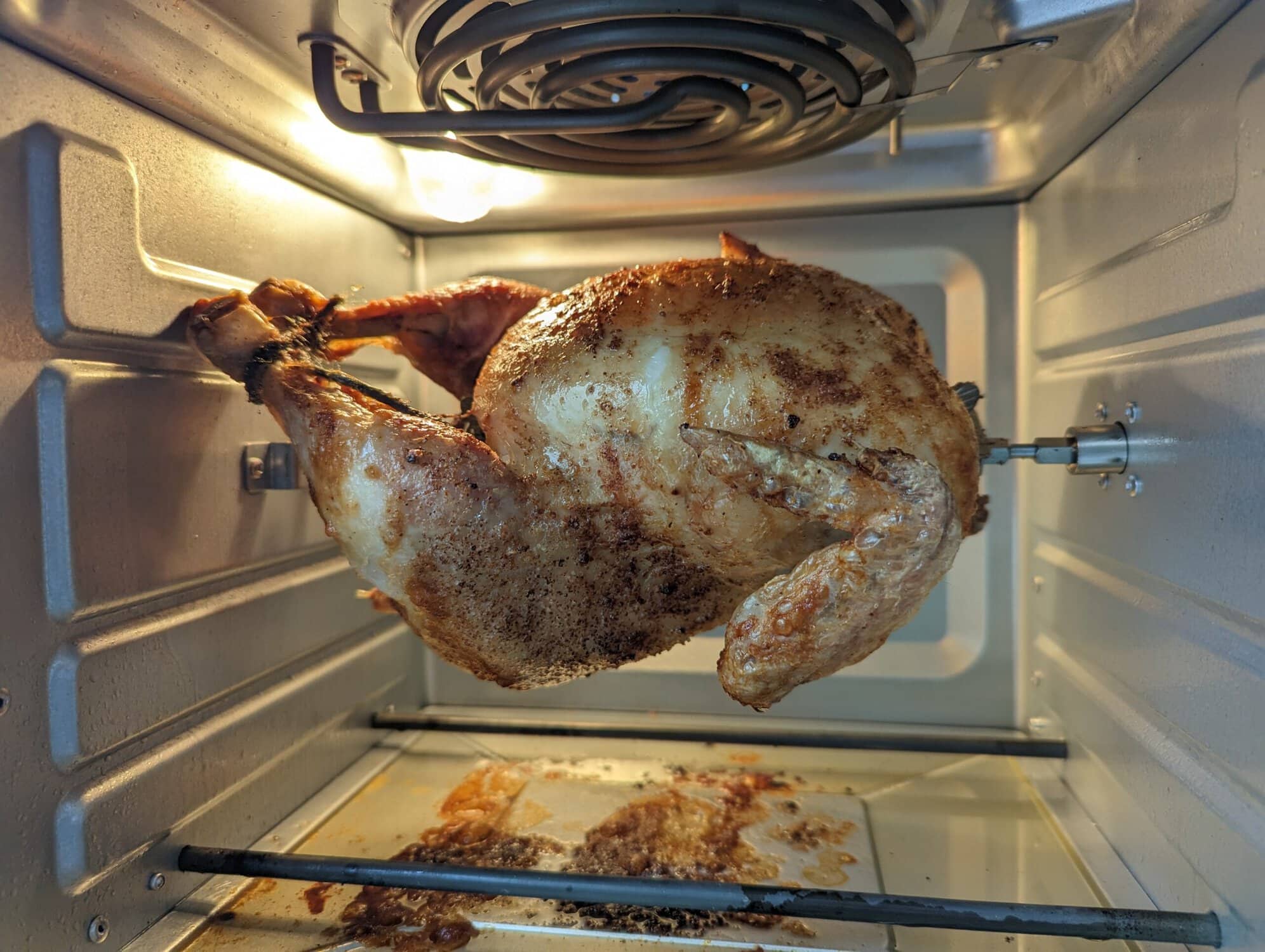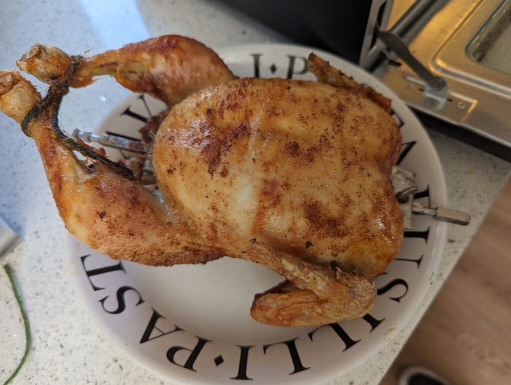 For the first test, I had to try the rotisserie function first. As this is a smaller over, I bought a medium chicken from Aldi, which fitted easily. I quickly learned from the last review that it is best to tie up the legs with twine to avoid them catching on things.