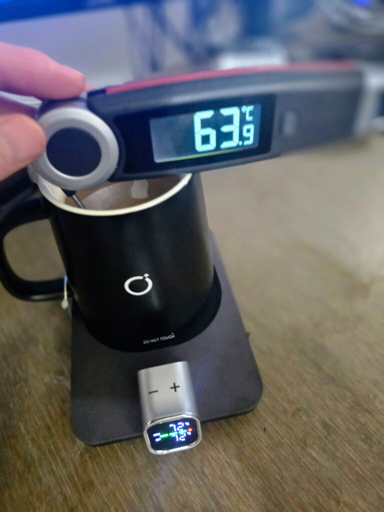 One minor issue is that the temperature on the LCD display does not match the liquid inside. Using a food thermometer in the liquid, there was roughly a 10-degree difference. However, it is recommended that coffee is served between 49°C and 60°C, and the ikago can easily hit these temperatures.