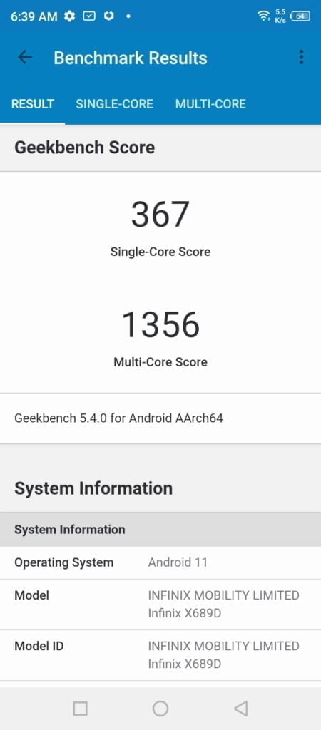 In Geekbench, the phone achieved 367 and 1356, which is fractionally ahead of the Realme 6i, which uses the Helio G80.