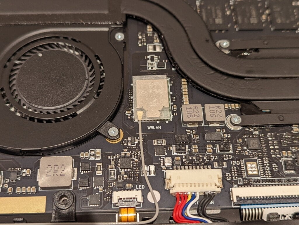 Opening up the laptop reveals that the WLAN card is integrated directly onto the motherboard and it uses a single antenna design, which is likely the culprit for the poor signal.
