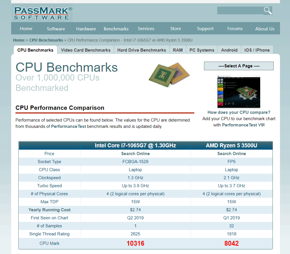 Both the Core i7-1065G7 and Ryzen 5 3500U contain four cores and eight threads, yet the Core i7-1065G7 manages to score a CPU score of 10316 compared to the Ryzen 5 3500U’s score of 8042. In this case, the Core i7-1065G7 outperforms the Ryzen 5 3500U by 2274 points, or by 22%.