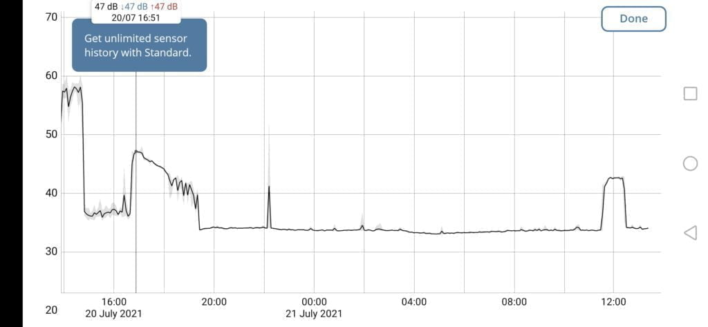 Neither of those readings will be accurate, but it gives you a rough idea in terms of dB. In terms of perceived noise, it is loud enough that I need to turn the TV/music up in my office. Not as loud as a vacuum cleaner but probably louder than most fans at full speed. The sound profile is OK with a general low to mid-end whooshing sound, so if you don’t mind noise, it may not be too bad.