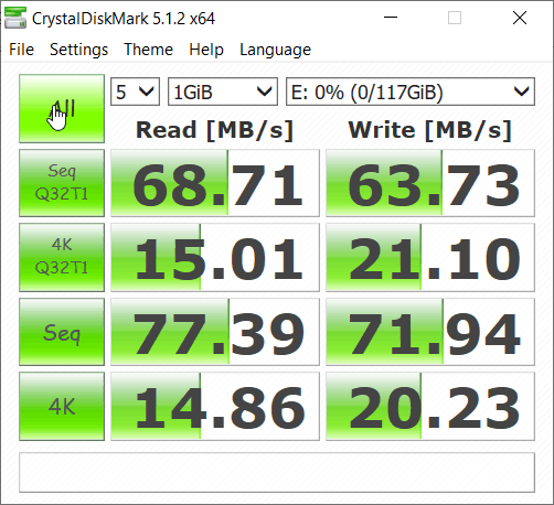 Using both my desktop PC and the Acer Predator Helios 300 laptop, I found the performance to be lower than the stated speeds. For large files this was around 70-80MB/s for reads and 65MB-72MB/s for writing.
