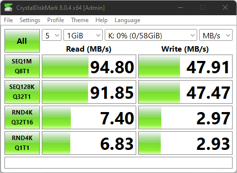 The Kingston Canvas React Plus drive I happened to have on my table during this review achieves speeds of 93MB/s and 86MB/s. Even though it has faster sequential write speeds, it is slower with random read writes.