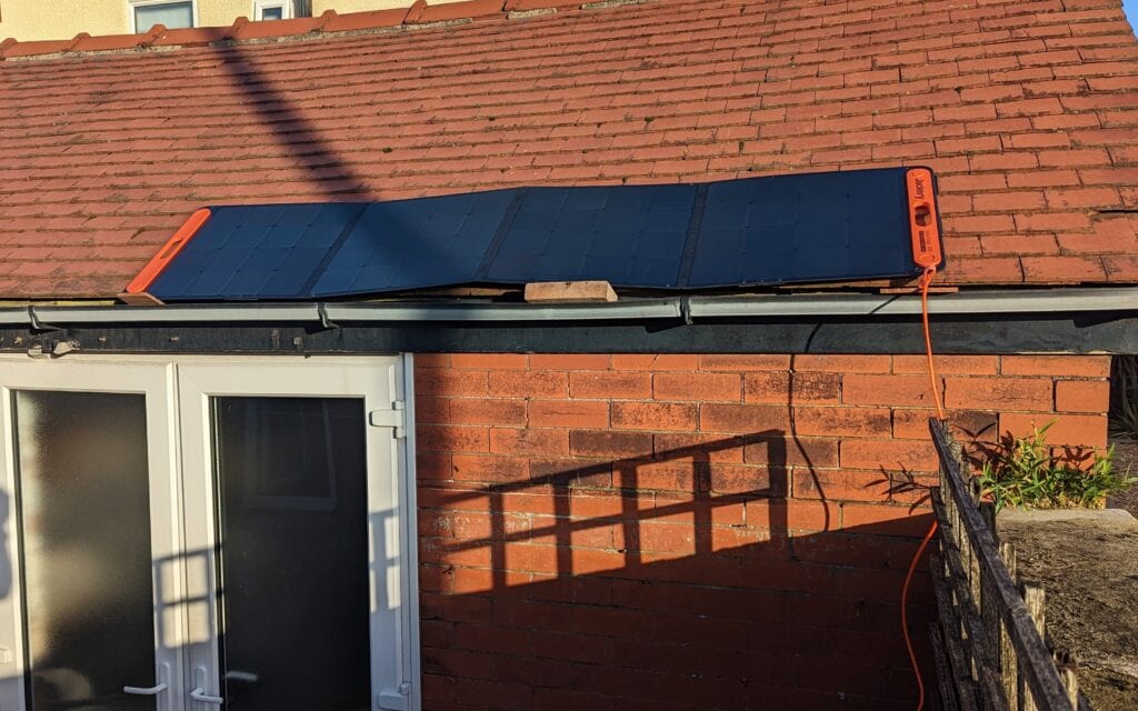 The only hint of sun I got was one morning. I would have been best to set up the panels in my front garden, but I didn’t fancy leaving expensive solar panels unattended in my deprived town. I managed to get one on the roof of my garage, where I was able to achieve a peak of 100W input. Not great, but, not bad considering the inclement weather and the fact it was 10 am in the morning.