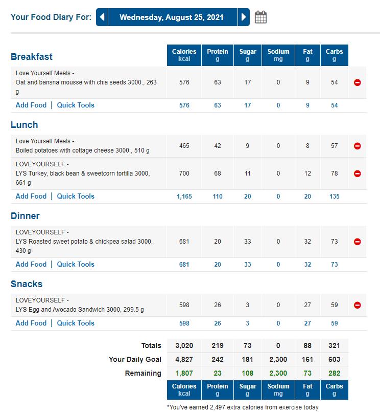 I noticed one online review claim the food is unseasoned, while another claimed it had too much salt. Knowing what professional chefs and packaged food is like with salt, I expected these to be overloaded, however, this is not quite the case. Looking at the reported nutritional values, it comes in at about 5-6g so the top end of your RDA, and this is for the 3K plan, lower-calorie counts should have less salt. It would be good if Love Yourself included this data in MyFitnessPal.