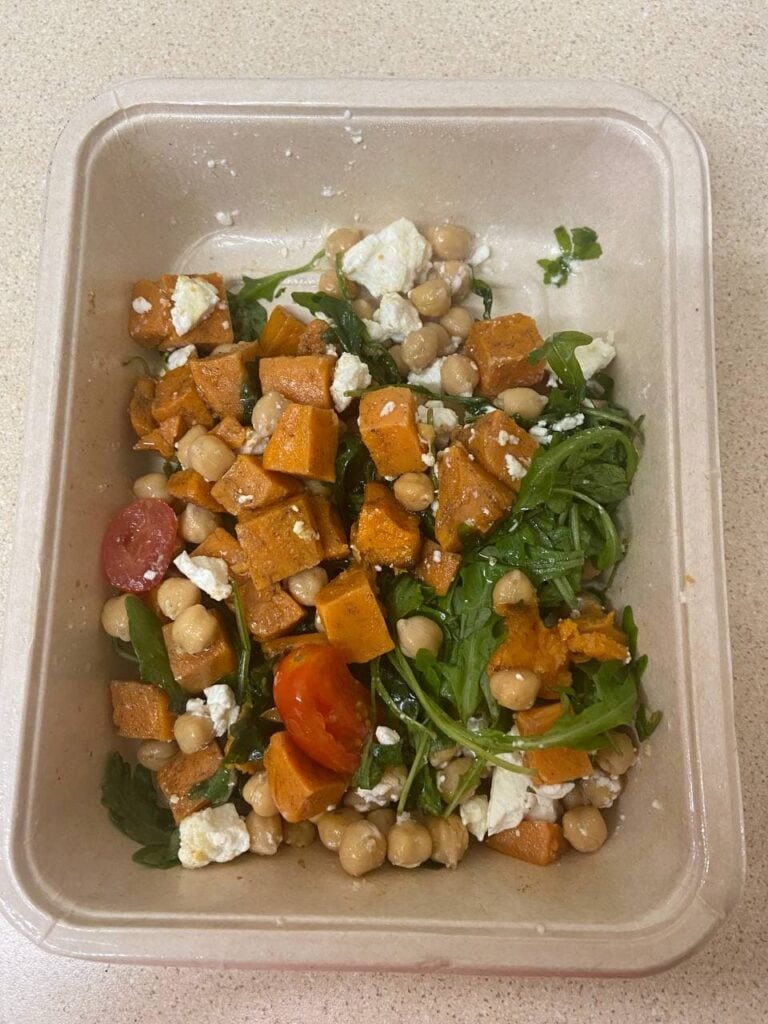 - I palmed this one off on my partner in favour of something more calorific. However, it tasted nice. It would have worked better for a mid-day meal. Again, this was quite calorie dense, especially for a salad. The three main ingrediates were sweet potato, then chickpeas then feta.