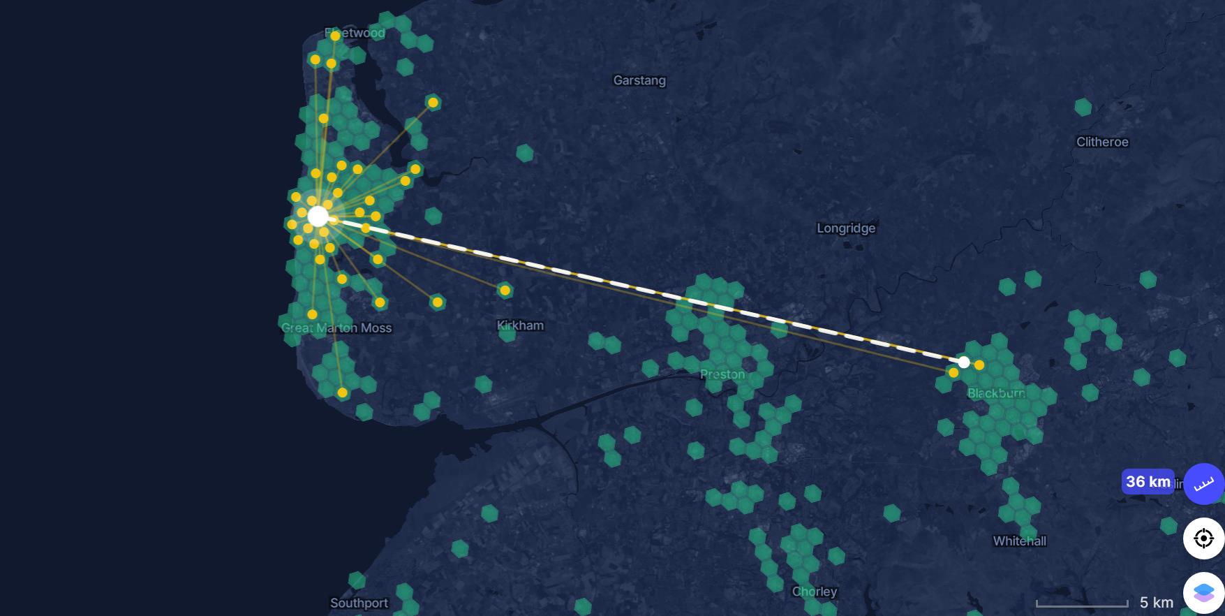 However, now I had a much higher density of local hotspots plus three going out as far as Blackburn which is measuring at 36km. I then have another 5 that sits around 10km away from me.