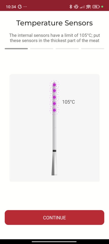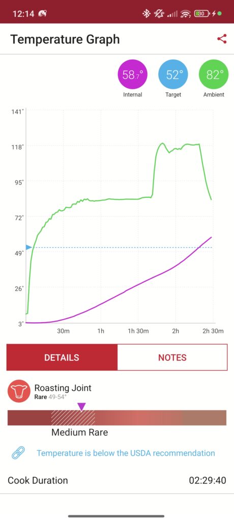 The app allowed me to select the specific meat type and desired doneness for each probe independently. Throughout the cooking process, the app displayed current temperatures, estimated completion times, and alerts when temperatures approached target levels.