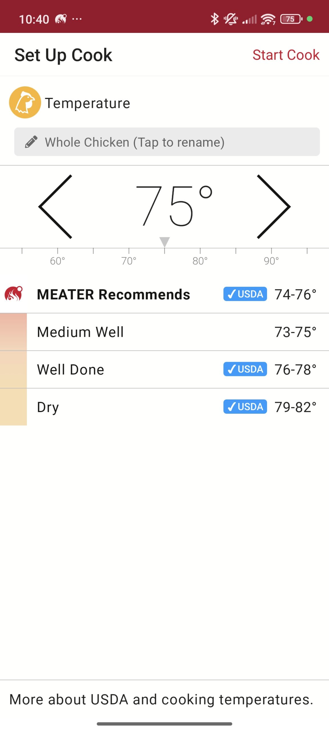 The ChefMaker would sometimes show slightly different temperatures, but I think this is due to a difference in probe placement. The ChefsTemp Finaltouch X10 would typically match the Meater when inserted properly.