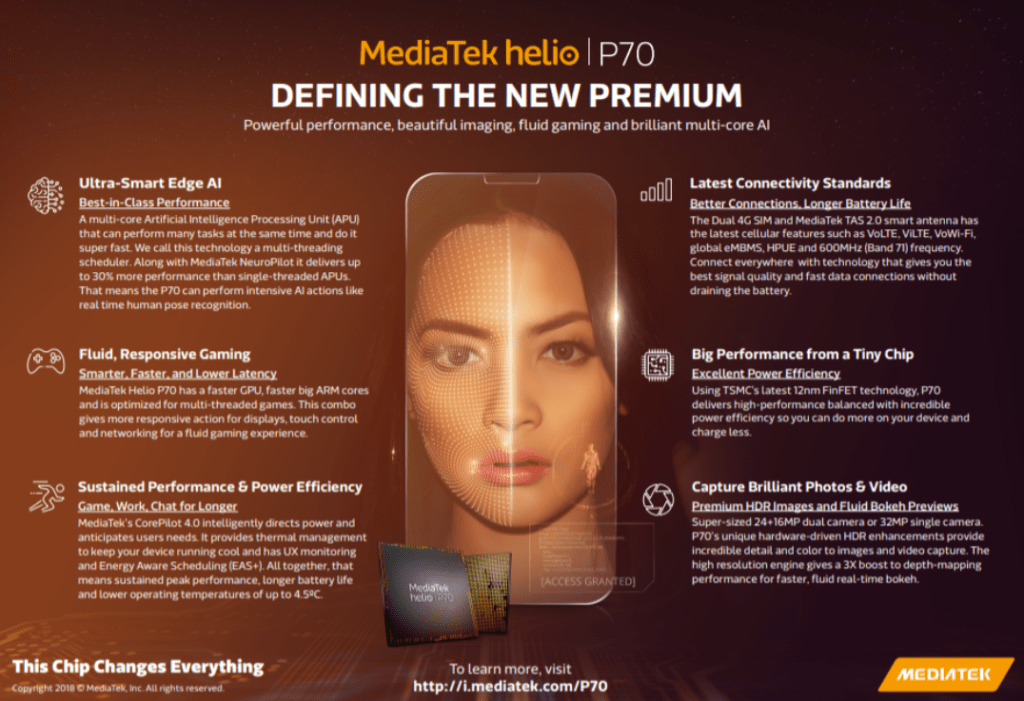 The Helio P70 supports up to 8GB of LPDDR4X and 4GB of LPDDR3 RAM. It also supports eMMC 5.1 and UFS 2.1 storage. Sadly, Bluetooth is still 4.2 (LE).