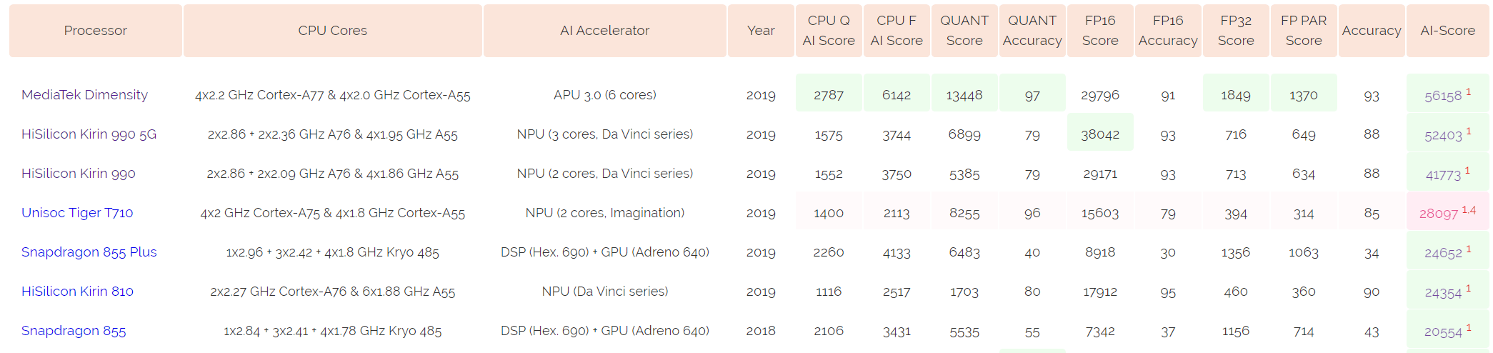 The benchmark indicates that the APU 3.0 has 6 cores in total and not three. The result puts it comfortably in the lead over the HiSilicon Kirin 990 5G. This chipset also adopts a 3 core approach with 2 big cores and 1 littles. One of the key features of the Kirin 990 has been its AI performance. While this chipset is designed for phones in 2020 it uses the older A76 CPU that is featured on the Kirin 980.