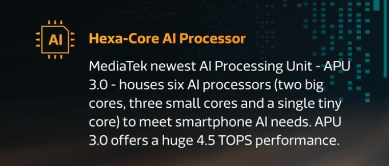 MediaTek also employs its own third-generation neural processing unit which it calls “APU 3.0”. They claim they have doubled the performance over its previous generation chipsets.