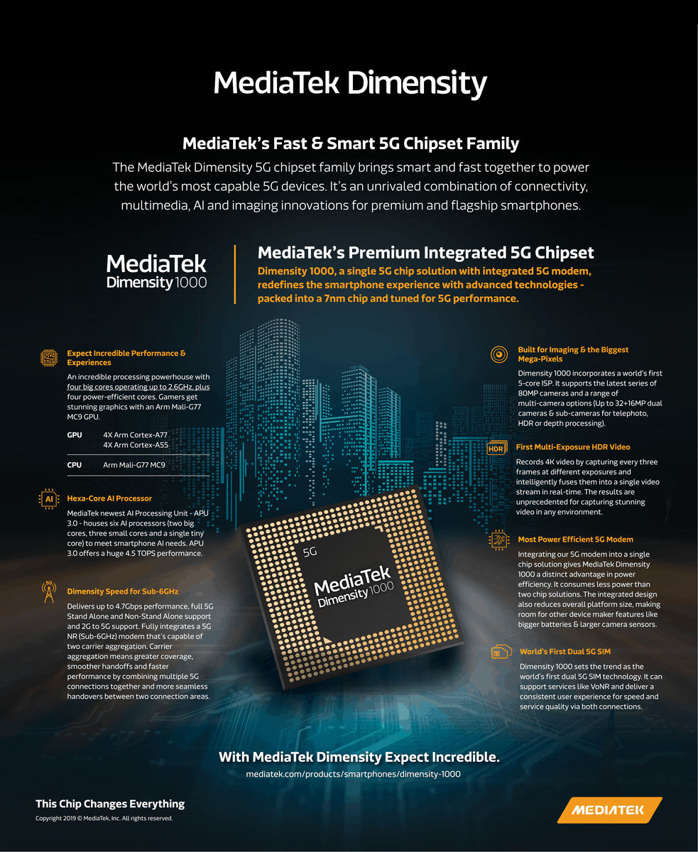 Each manufacturer approach to 5G has been interesting. MediaTek is perhaps taking the most radical approach and this is the first chipset to have an integrated 5G modem with no 4G alternative. So all phones with the MediaTek Dimensity 1000 should be 5G.