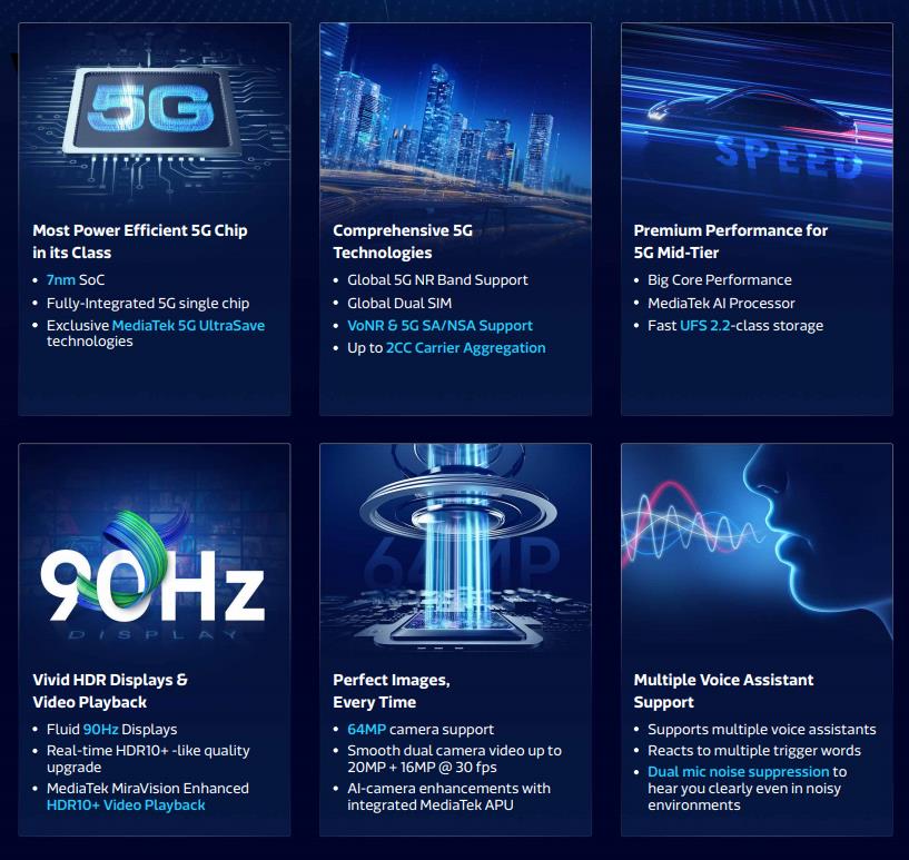 - Flexible camera configuration options with support for up to 64MP or 20+16MP dual cameras, plus a range of AI-camera enhancements powered by MediaTek’s integrated APU (AI Processing Unit).