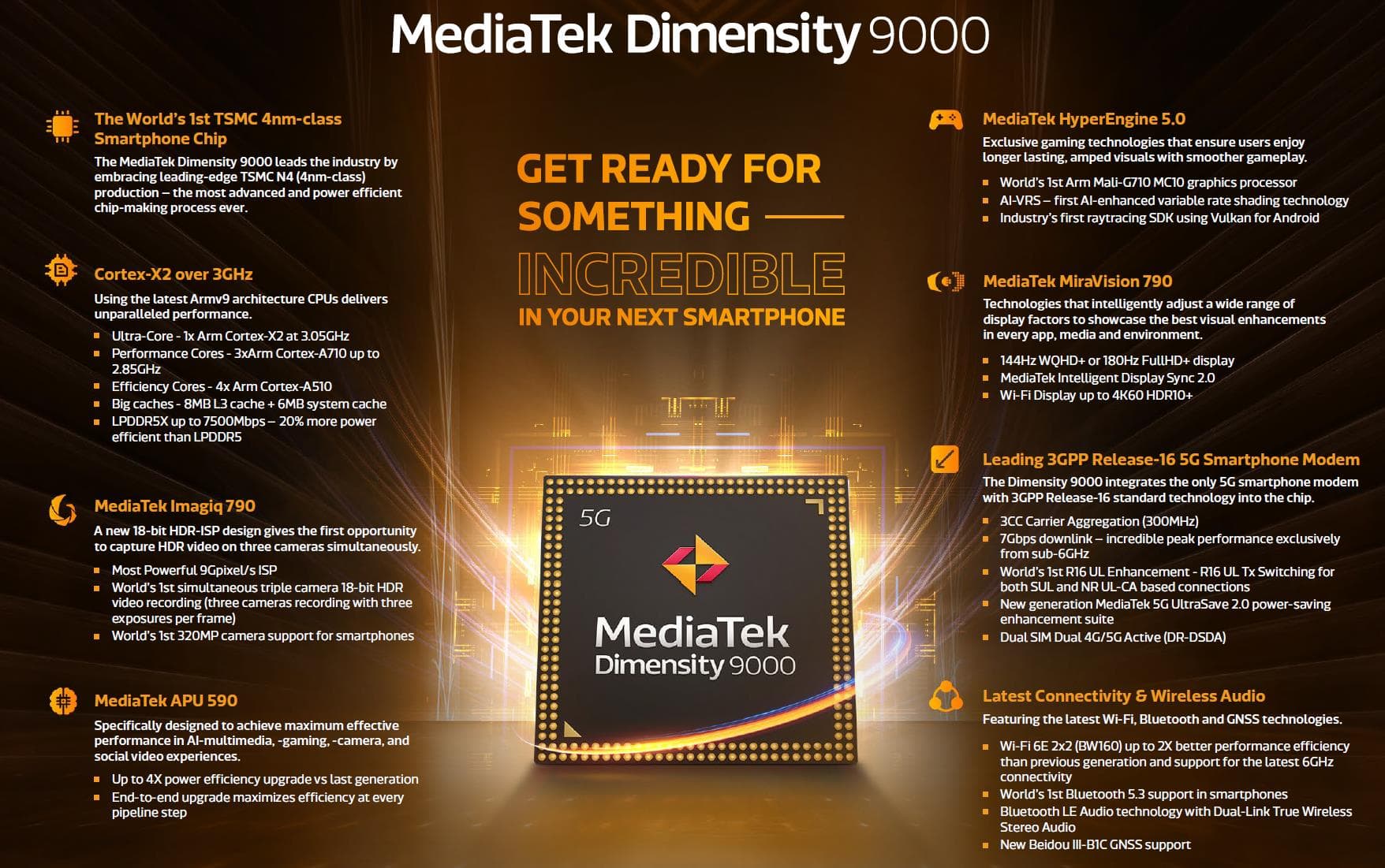 Additionally, the chipset integrates MediaTek’s fifth generation Application Processor Unit (APU 5.0), which offers 4X power efficiency gains compared to the previous generation APU, for the ideal balance of performance and power efficiency for a wide range of AI multimedia, gaming, camera and video experiences.