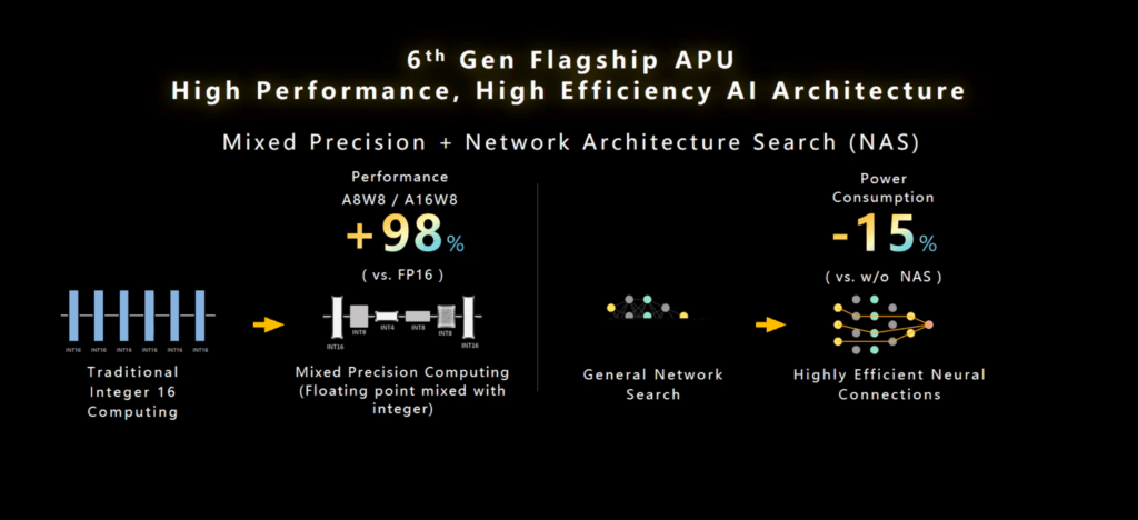 The chipset’s sixth-generation AI Processing Unit (APU 6.0) enhancements include up to 18% faster peak clock speeds and 30% power efficiency compared to the fifth-generation APU.