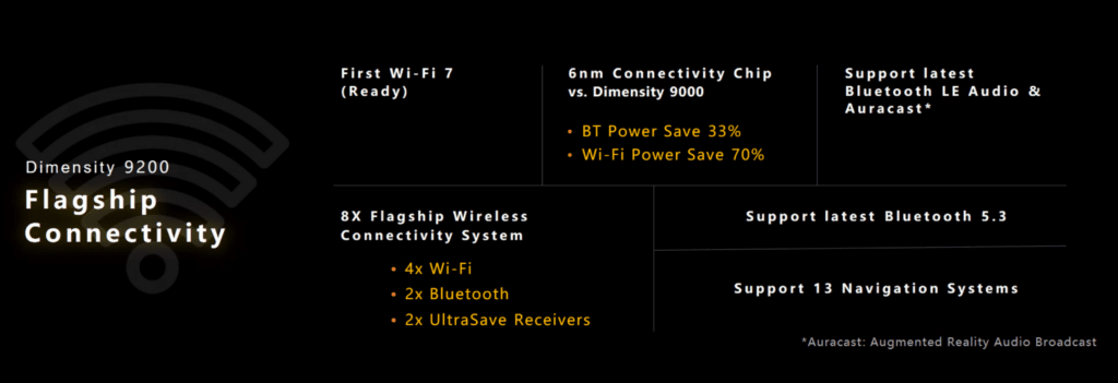The Dimensity 9200 is the first Wi-Fi 7-ready smartphone platform, supporting up to 6.5 Gbps data rates. At the time of writing, there are no Wi-Fi 7 routers, and it is likely OEMs will need to choose to integrate the Wi-Fi 7 functionality, so we may not see this next-generation networking standard for a while yet.